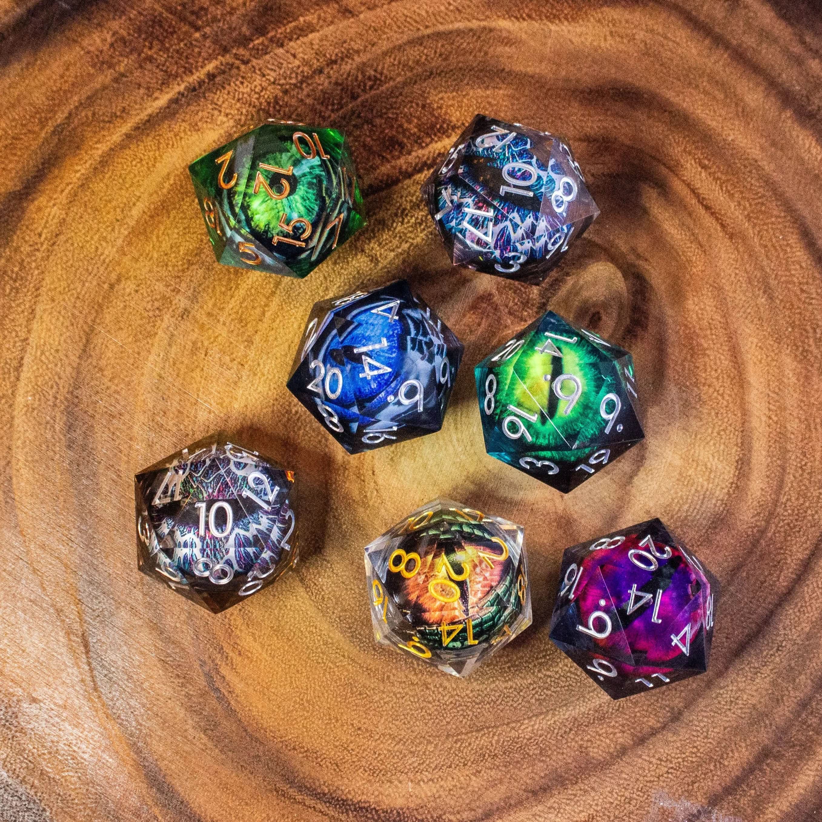 Crafted in the legendary forges, each d20 dice is imbued with a mesmerizing liquid core that swirls with the power of the arcane. The chunky design ensures a satisfying heft and roll, promising an unparalleled tactile experience.