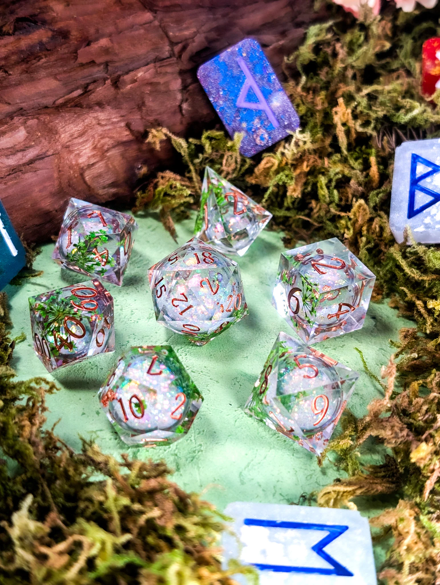 Delicate, ancient, and full of quiet life, the Druid's Craft liquid core dice set captures the stillness of untouched groves and the unseen magic that lingers in wild places. Cast in crystal-clear resin, each die cradles soft green blossoms, suspended as if floating in time. Wisps of white swirl gently within, like morning fog through forest leaves, while bronze numbering glows with the warmth of sunlit earth.