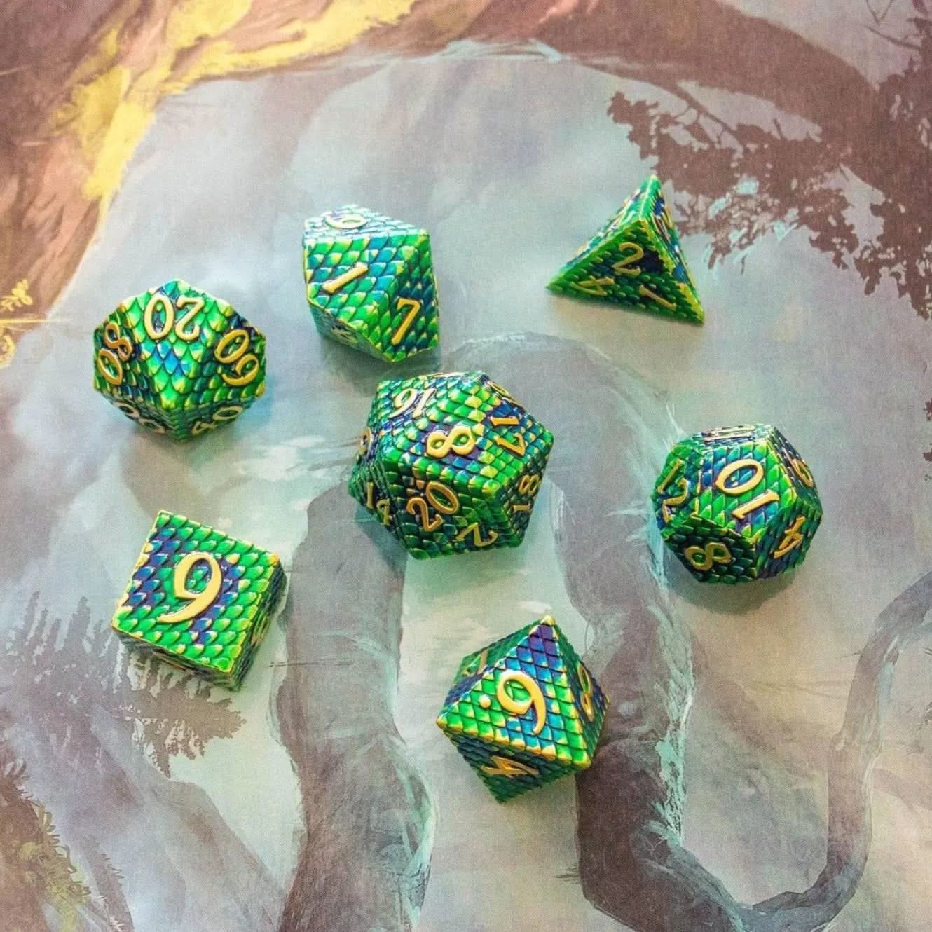 After a long and tiring expedition into the Dungeon, the party came across this beautiful Dragon Scale metal Dice Set
