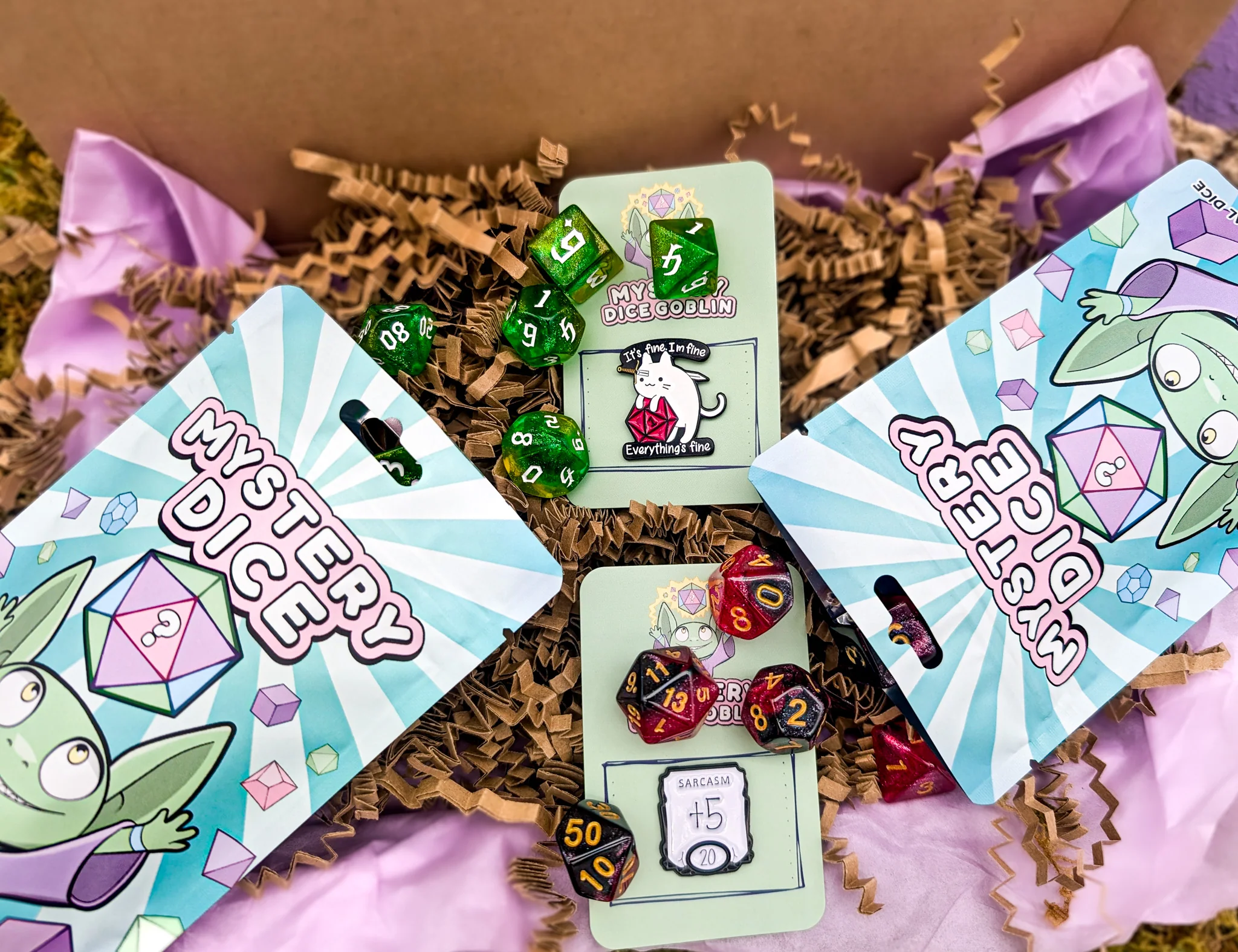 Looking for a fun and exciting way to add a little mystery and surprise to your game? Look no further than our Mystery Boxes! Excellent quality dice and pins!