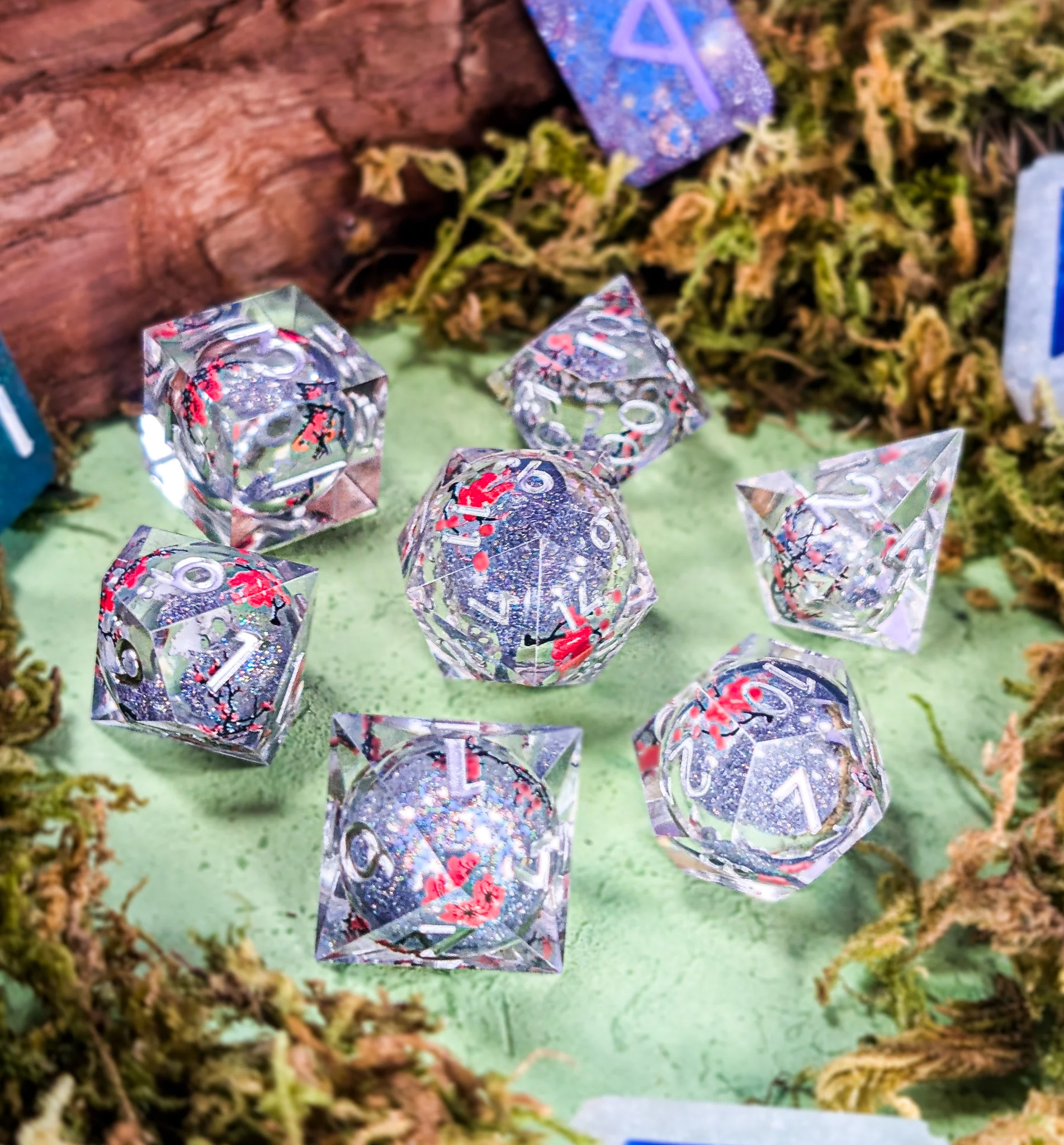 These liquid core dice are graceful and sharp as moonlight, glittering in their silver blossom veil. Created in a forgotten shrine, adventurers seek for these lost remnants of a wandering swordsmith.