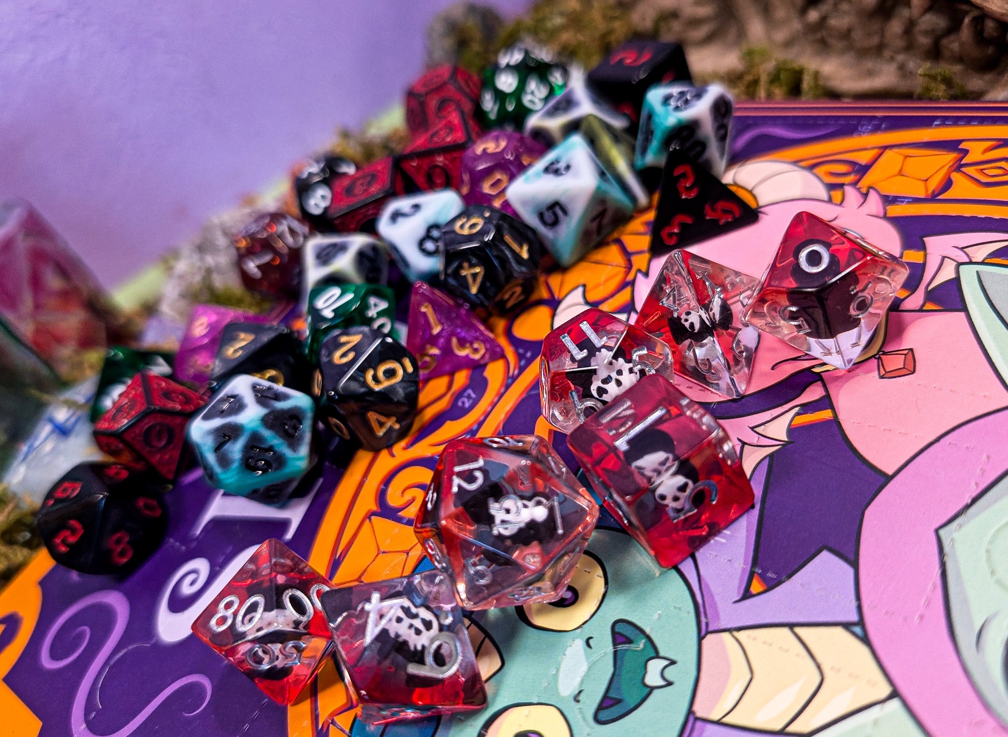 - Guaranteed 1 Matching Full Set of Dice Spooky themed Inclusion/Filled Dice (Grim reapers, devils, spiders and ghosts!)