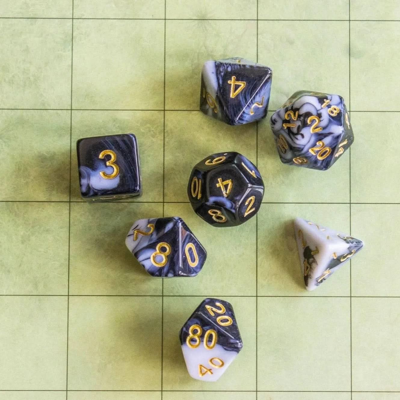 - Traditional 7-piece RPG dice set – D4, D6, D8, D10, D12, D20 and Percentile Dice
